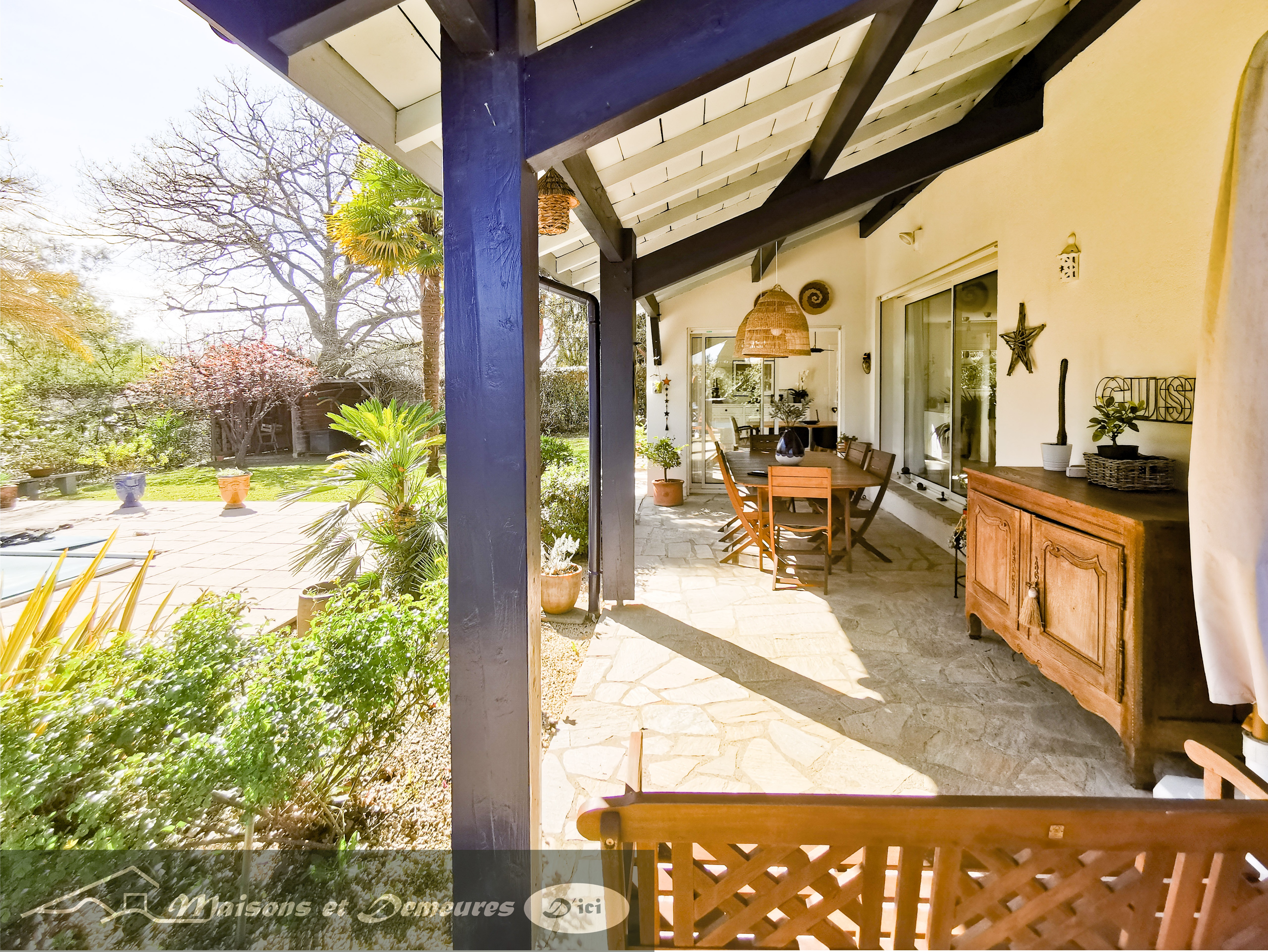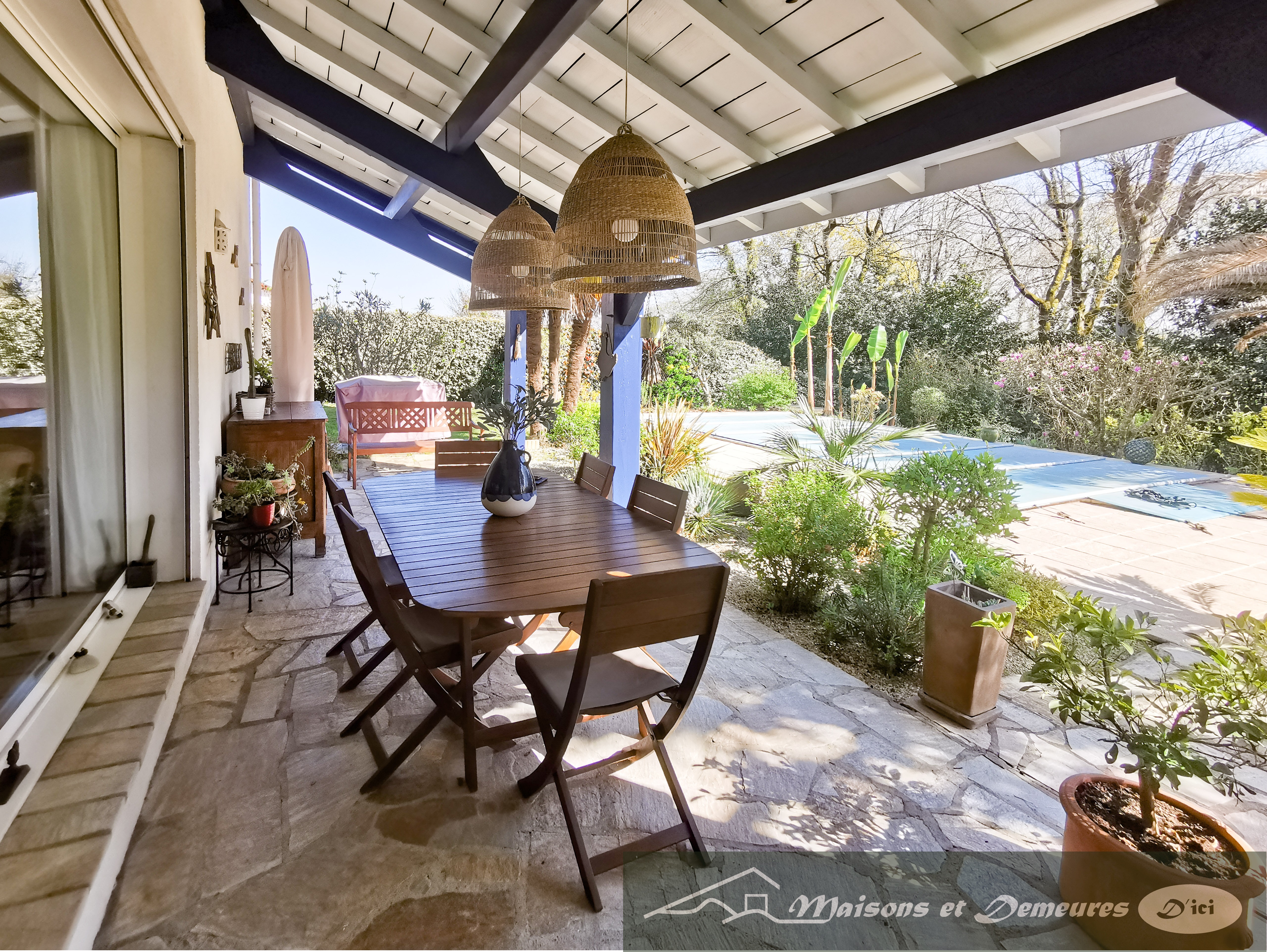 Point d’orgue du bien être ambiant, une belle terrasse couverte au Sud, face à la nature et au bord de la piscine chauffée, très agréable à la belle saison.