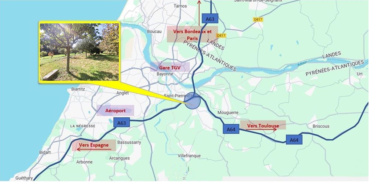 Emplacement stratégique, à la sortie de l'agglomération Biarritz/Anglet/Bayonne, et tout proche de l'accès aux autoroutes A63/A64. Gare TGV à 5 km. Aéroport de Biarritz à 15 mn.